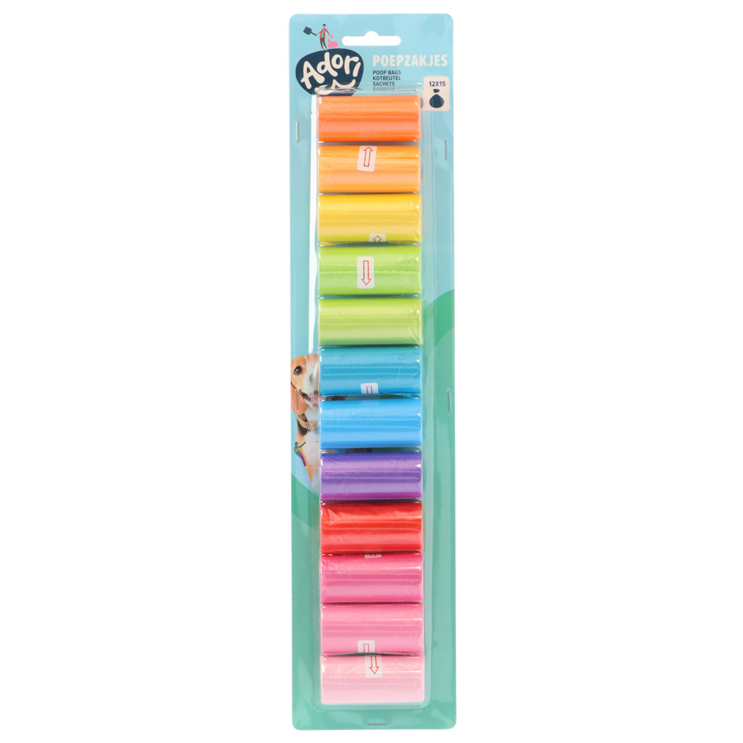 De Adori Regenboog Poepzakjes zijn gemaakt van plastic, ze mogen dus niet in de groenbak. Wel mag je ze deponeren in de daarvoor bestemde afvalbakken van de gemeente. In één verpakking vind je 12 rolletjes in verschillende kleuren, met 15 zakjes per rol.