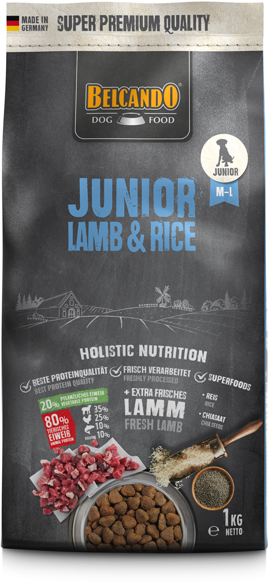 Vers(e) lamsvlees, -lever, -long (totaal: 30%), rijst (30%), havermeel uit geschild zaad, lamseiwit gedroogd (10%), gevogelte-eiwit as-arm gedroogd (7,5%), vismeel van zeevis (3,5%), bietendroogsnijdsel ontsuikerd, ei gedroogd (2,5%), gelatine gehydrolyseerd (2,5%), biergist gedroogd (2,5%), Johannesbroodschroot gedroogd, gevogeltevet, plantenolie (palm, kokos), chiazaad, gevogeltelever gehydrolyseerd, natriumchloride, kaliumchloride.
