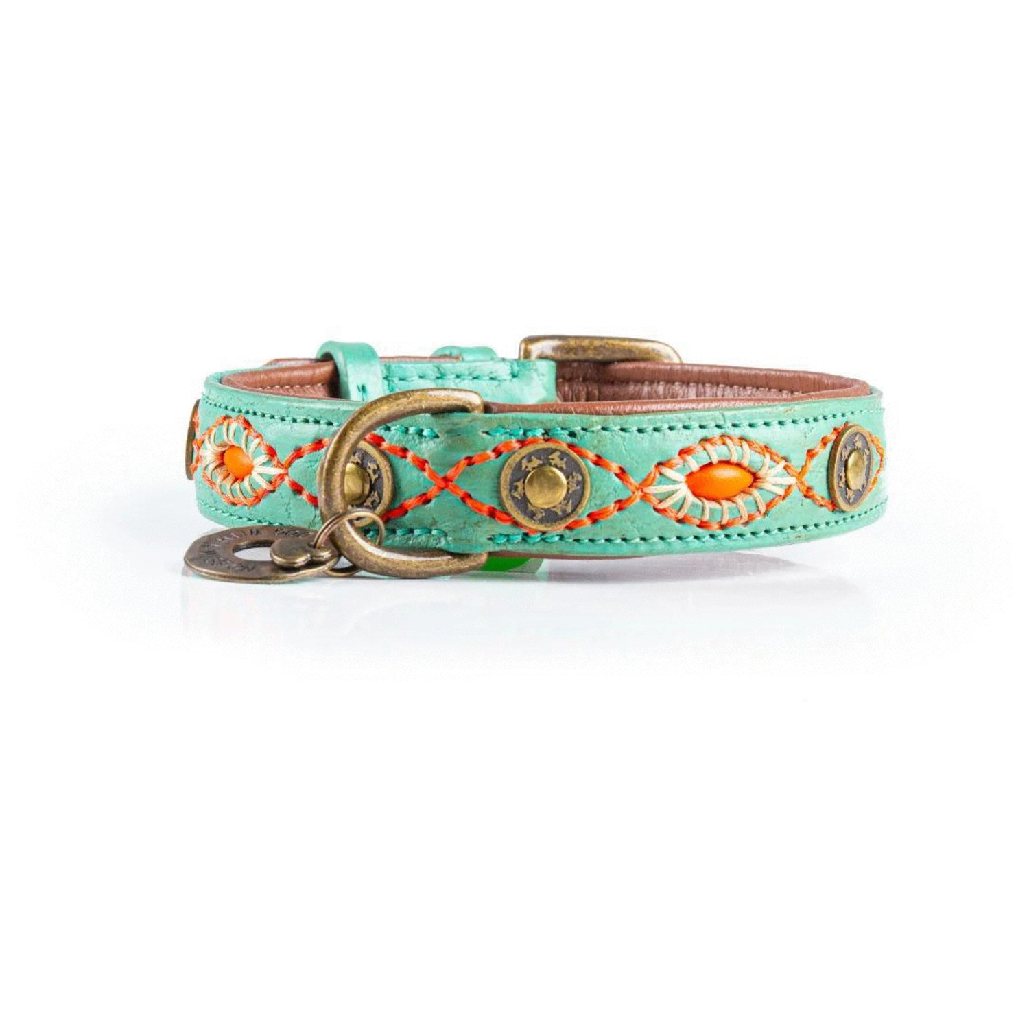 Wanneer je op pad gaat met je hond, wil je er natuurlijk wel flitsend uitzien. DWAM heeft een assortiment met prachtige riemen en halsbanden waarmee je hond er altijd stijlvol bij loopt. De Janis van Dog With A Mission is een handgemaakte, oersterke halsband voor je viervoeter. De Janis is gemaakt van leer met turquoise en roze details voor een bohemian look. De halsband wordt afgemaakt met een bedeltje.